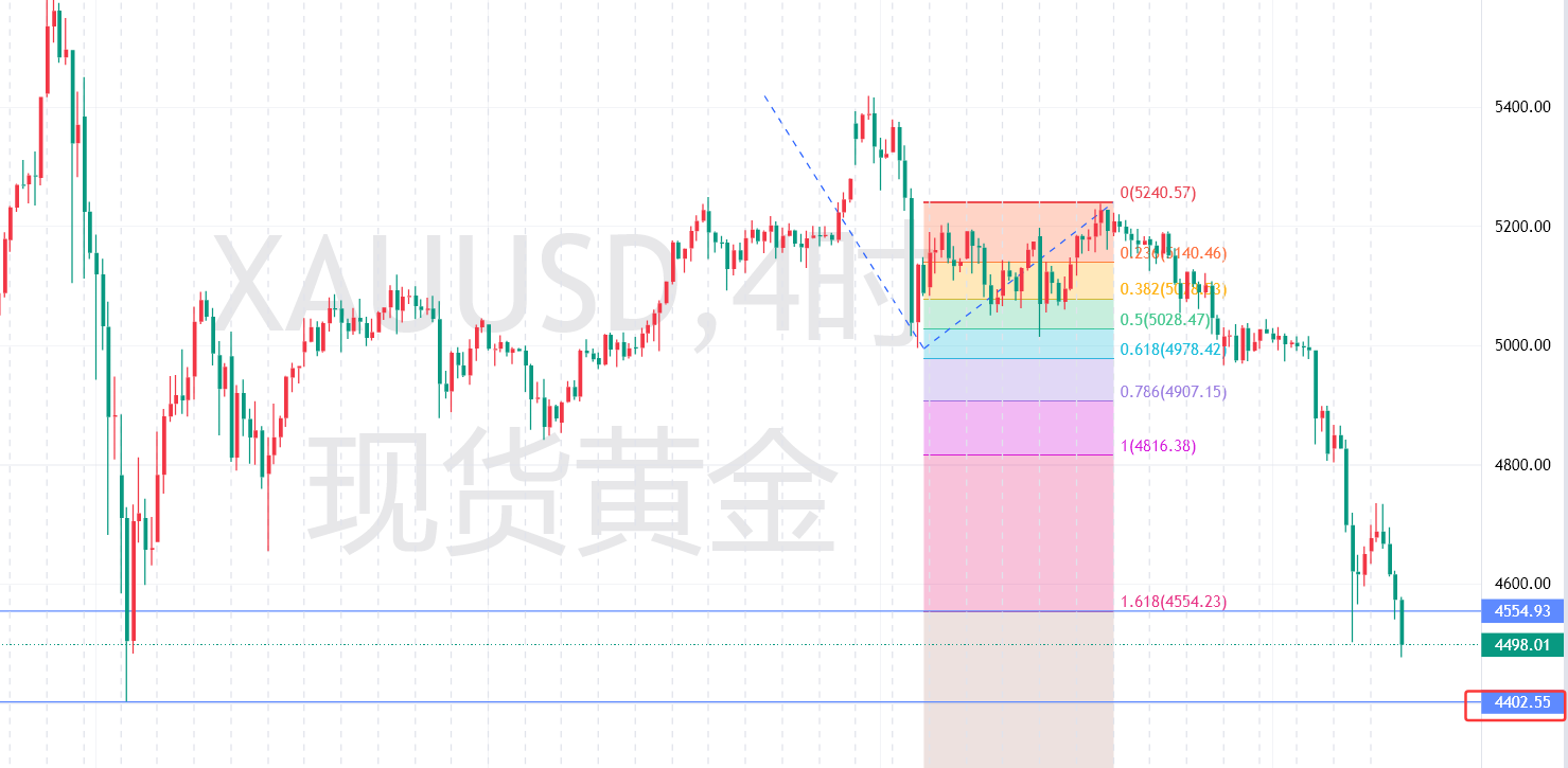 本周收盘已明确确认,黄金空头趋势完全确立,且动能强劲 ,短期内无任何反转迹象。本周是黄金彻底转向空头的关键一周,6年来最大单周跌幅,连续跌破六大整数关口 ,多重利空共振导致金价承压下行,空头趋势全面确立。后续行情,空头仍将主导全局 ,短期反弹仅为技术性修复,无法改变整体下行格局 。短期来看,金价将继续围绕4500关口震荡整理 ,重点关注4450-4500美元区间的支撑力度,若有效跌破4450美元,将进一步下探4300-4200美元区间;中长期来看 ,美联储鹰派政策 、高通胀预期、强势美元的格局短期内难以改变 ,黄金下行趋势明确,仍有进一步下行空间,切勿抱有侥幸心理认为行情已见底。